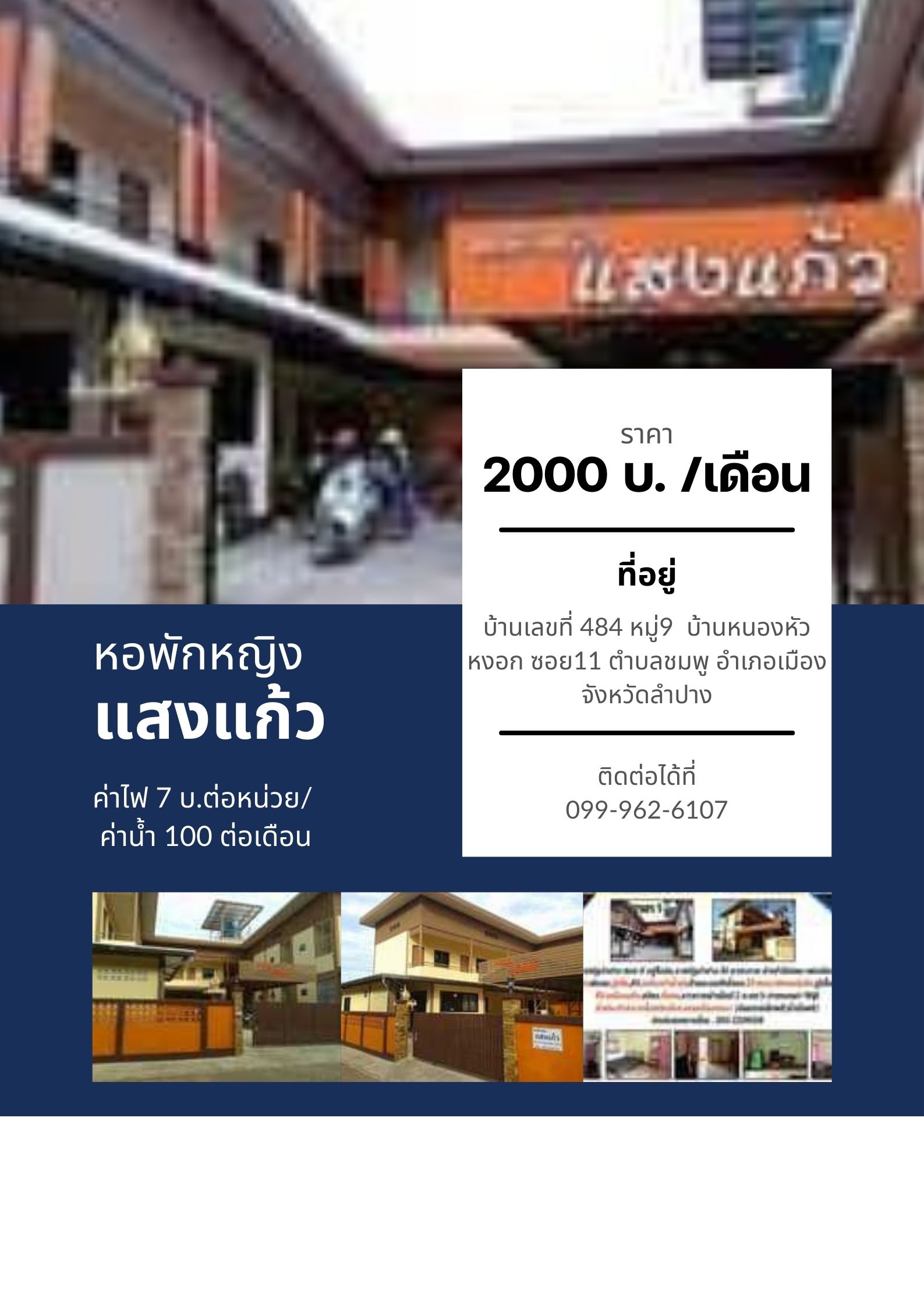BlogUncategorizedWIFI หอพักหญิงแสงแก้ว By พรรษา เบนซ์ Last updated มี.ค. 27, 2024 0 Share ค่าห้อง 2000 บ. /เดือน ค่าไฟ 7 บ.ต่อหน่วย/ ค่าน้ำ 100 ต่อเดือน 0 Share FacebookTwitterGoogle+ReddItWhatsAppPinterestEmail