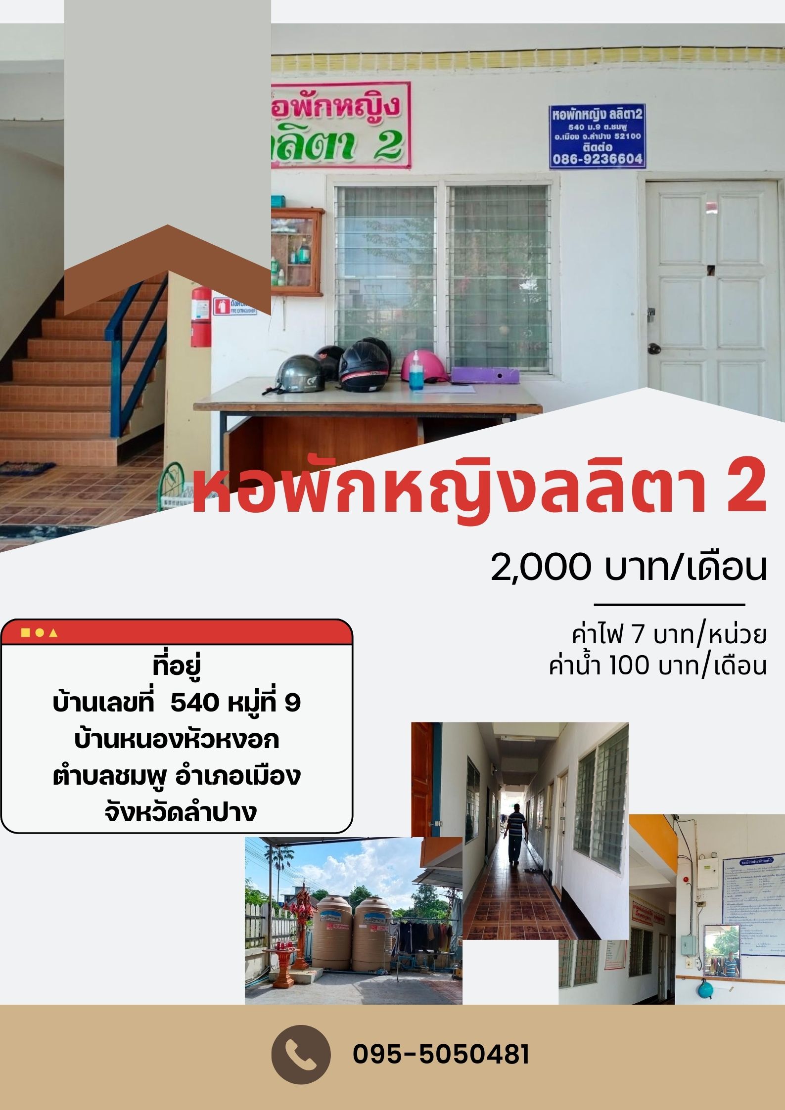 BlogUncategorizedWIFI หอพักหญิงลลิตา 2 By พรรษา เบนซ์ On มี.ค. 27, 2024 0 Share ค่าห้อง 2,000 บาท/เดือน ค่าไฟ 7 บาท/หน่วย ค่าน้ำ 100 บาท/เดือน 0 Share FacebookTwitterGoogle+ReddItWhatsAppPinterestEmail